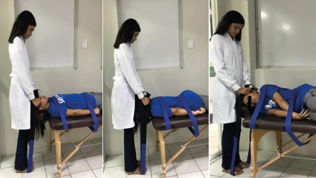 For the cervical spine flexion muscle strength, the volunteer was positioned in the supine position, knees and hips extended with the Velcro® belts placed firmly, one crossing the pelvis, and the other on the trunk, in order to reduce muscular movements and compensations during the task. Finally, the dynamometer was positioned on an imaginary midline, over the frontal bone. An MVIC was then requested by applying force against the dynamometer supported by the evaluator with instructions not to elevate the head, neck or chin (LODOVICHE, 2018).