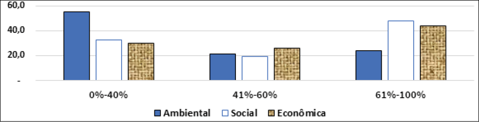 Nesse sentido, os resultados mais expressivos referem-se ao fato de que a dimensão ambiental é a que menos prioridade vem recebendo dos gestores fabris participantes do estudo, seguida da dimensão econômica. Por outro lado, a dimensão social é aquela na qual o melhor desempenho foi constatado, visto que um maior número de indicadores (6 de 13) apresentou percentuais de utilização das práticas de sustentabilidade no nível “entre 61% e 100%”. Acerca disso, aventou-se a possibilidade de que esse nível de prioridade advenha de exigências das legislações trabalhista e de defesa do consumidor.