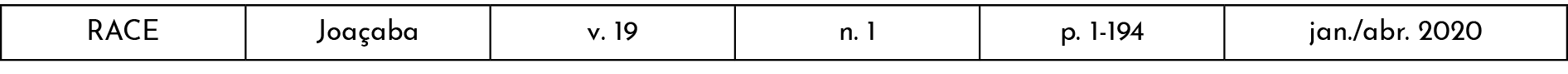 RACE : Revista de Administração, Contabilidade e Economia / Universidade do Oeste de Santa Catarina – Vol. 1, n. 1 (jan.-dez. 2002)- . – Joaçaba : Ed. Unoesc, 2002- v. : il. ; 23 cm. Anual, 2002-2005; semestral, 2006--2013; Quadrimestral, 2014- Qualis Capes B3 ISSN 1678-6483 — ISSN on-line 2179-4936 1. Administração – Periódicos. 2. Contabilidade – Periódicos. 3. Economia – Periódicos. I. Universidade do Oeste de Santa Catarina. CDD 658.005 |