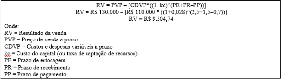 Pela margem de contribuição, o resultado da venda representado no exemplo fictício citado na Figura 2 seria de R$ 20.000 (R$ 130.000 – R$ 110.000). Porém, se empregada a fórmula de mensurar o resultado que abrange os efeitos dos prazos do ciclo financeiro, o lucro da operação passaria para R$ 9.504,74. Conclui-se, assim, que o prazo de duração do ciclo financeiro (3,3 meses) afetou o resultado final da venda a ponto de reduzi-lo em R$ 10.495,26, passando a ser apenas 52,48% do valor da margem de contribuição. Ou seja, da margem de contribuição de R$ 20.000 se desconta o valor das despesas financeiras (R$ 10.495,26) decorrentes da duração do ciclo de conversão de caixa para apurar o resultado “financeiro” da venda (R$ 9.504,74).